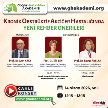 Göğüs Hastalıkları Platformu olan GÖĞÜS HASTALIKLARI AKADEMİSİ (www.ghakademi.org)’nde 14 Nisan 2026 Salı günü Saat 12:15’te “KRONİK OBSTRÜKTİF AKCİĞER HASTALIĞINDA YENİ REHBER ÖNERİLERİ” Canlı Konseyi gerçekleştirilecektir.